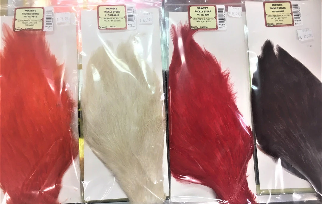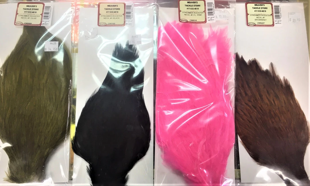 Wapsi Streamer Rooster Necks are very versatile fly tying necks. These grade #1 necks have a variety of uses from tying saltwater flies like tarpon streamer and Deceivers to warmwater patterns for bass bugs, poppers, streamers and even pike flies. These Wapsi Streamer Rooster Necks even work well on spey flies, steelhead and salmon flies. They are available in a very wide variety of colors and the feathers feature a wide size range and thin quills making them easy to use. These are available as a great economical neck at a great price.